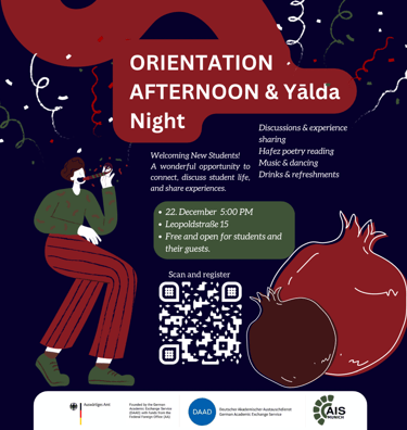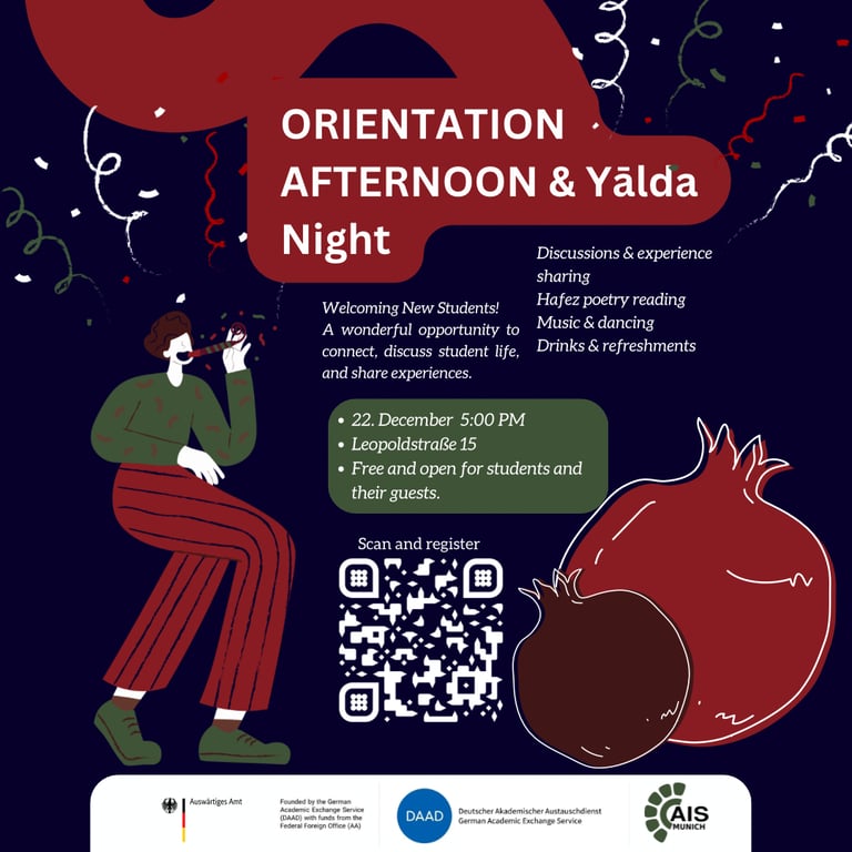 We warmly invite international students, especially arriving students for the Winter semester 2025, to the AIS-Munich "Welcome Afternoon & Yalda Night", where You can meet up with fellow international students and professors, gather tips on life in Munich, especially as expats, and get familiar with AIS-Munich members and activities. Afterward, we will celebrate the year's longest night (Yalda Night). There will be Iranian specialties, beverages, snacks, and more!