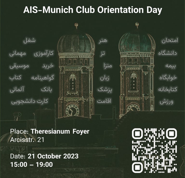 We warmly invite international students arriving for the summer semester 2024 to the AIS-Munich welcome meeting. You can meet fellow senior and newly-arrived international students, gather tips on life in Munich, especially as expats, and get familiar with AIS-Munich members and activities. You can also enjoy some Iranian beverages and snacks. The meeting will be held hybrid (in-person and online) and bilingual in Persian and English.