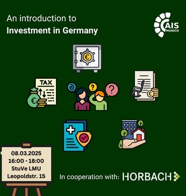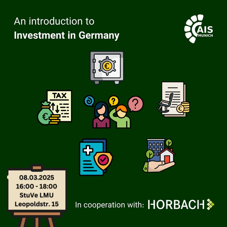 In this meeting, Julius Kolb, a financial advisor at Horbach, will discuss the basics of investment opportunities in Germany, covering topics such as stocks, private pension plans, and real estate. After the presentation, there will be an opportunity for you to explore additional options and ask questions.