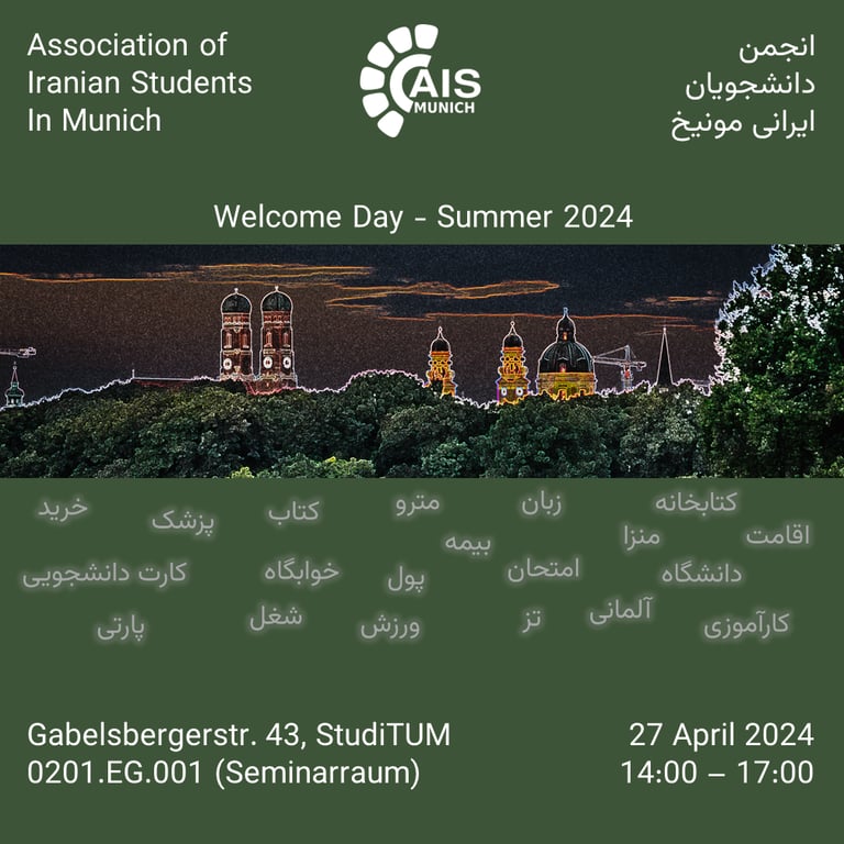 We warmly invite international students arriving for the summer semester 2024 to the AIS-Munich welcome meeting. You can meet fellow senior and newly-arrived international students, gather tips on life in Munich, especially as expats, and get familiar with AIS-Munich members and activities. You can also enjoy some Iranian beverages and snacks. The meeting will be held hybrid (in-person and online) and bilingual in Persian and English.