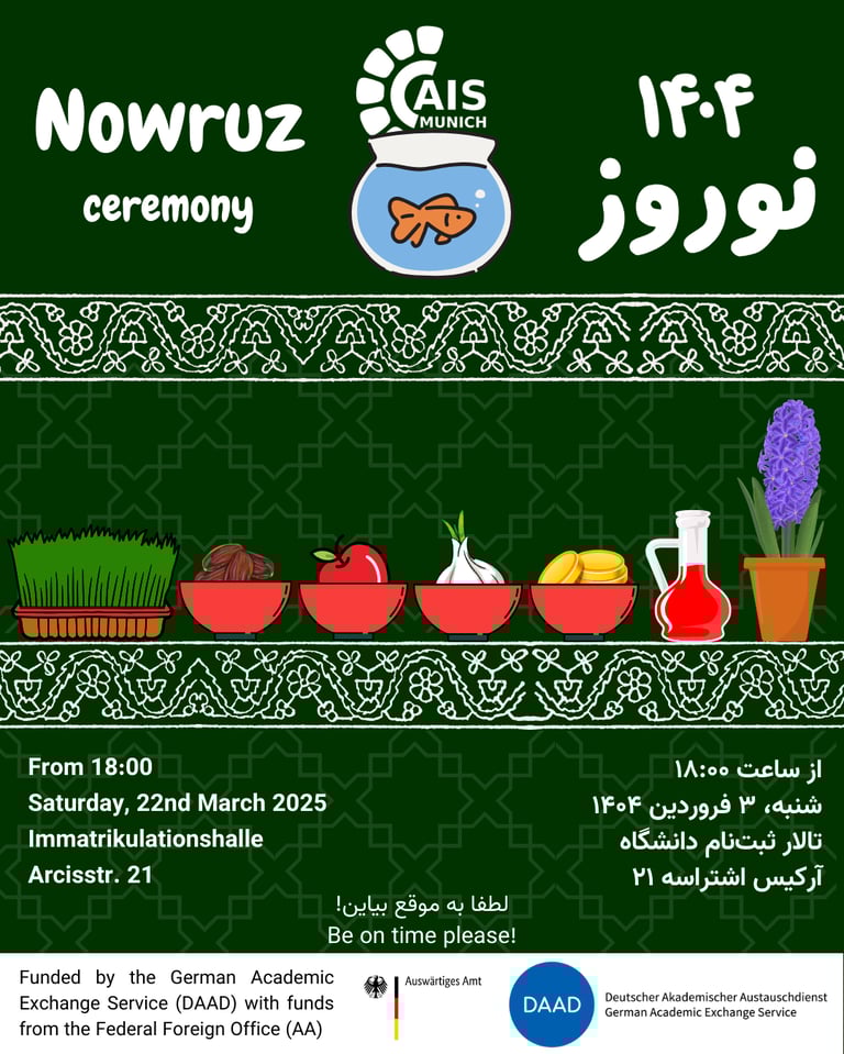 We warmly invite international students, especially arriving students for the Winter semester 2025, to the AIS-Munich "Welcome Afternoon & Yalda Night", where You can meet up with fellow international students and professors, gather tips on life in Munich, especially as expats, and get familiar with AIS-Munich members and activities. Afterward, we will celebrate the year's longest night (Yalda Night). There will be Iranian specialties, beverages, snacks, and more!